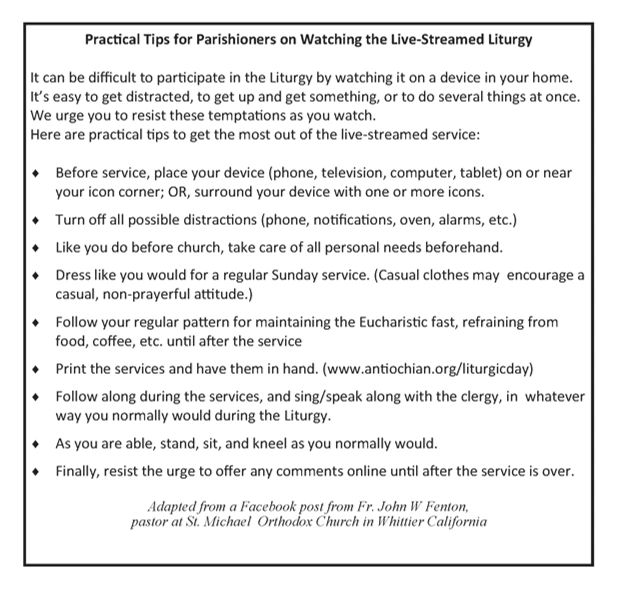 For the health of our community and your safety, we are limiting the number of individuals in the church at one time to 5 people (a combination of priests, chanters and servers). To read more ondirectives from our Metropolitan Joseph and our civil authorities on stay-at-home orders, please click the links below: